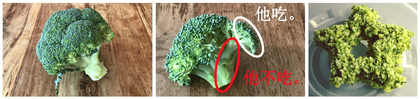 我的意思是,他只吃小花。他拒绝吃任何小花的根茎。让我举个例子,请看中间(左一)图片,我通常会吃西兰花根茎。请看中间(左二)图片,这就是他所看到的。他经常在盘子上留下一堆小花根茎,而吃完小花的部分。我通常甚至懒得试图为他提供整个较多的西兰花(包含根茎的部分)。